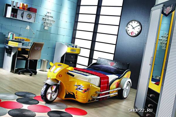 Необычная детская комната порадует юного владельца своим необычным дизайном, связанным с автомобилями и мотоциклами. Даже верхние ящики комода, который входит в комплект комнаты, открываются как ящик с инструментами. А кровать отделана кожзаменителем, оснащена фарами и имеет звуковые эффекты.