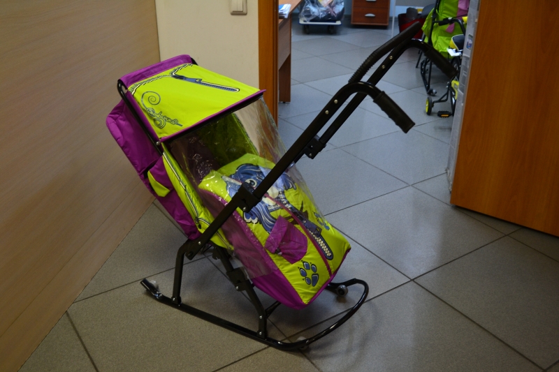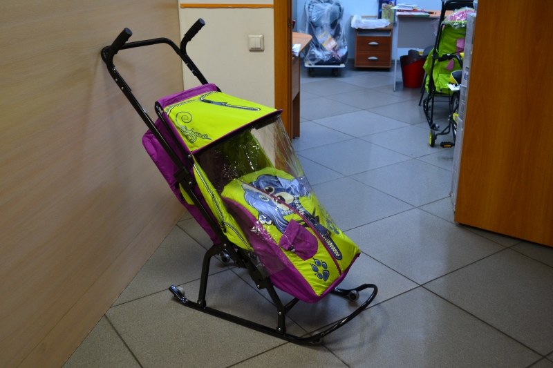 Санки-коляска "Снегурочка-4-Р" просто созданы для города! Для езды по бесснежным участкам у этих санок есть ещё и колесики, причем и спереди, и сзади. Перекидная ручка-толкатель позволяет малышу ехать лицом к маме или смотреть на дорогу. Комплектуется ветро- и снегозащитной пленкой, которая крепится к козырьку.