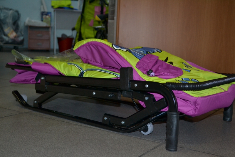 У санок-коляски Снегурочка 4-Р высокая спинка и широкое сиденье, чтобы даже в плотном зимнем комбинезоне малышу было просторно в санках. Спинка раскладывается в нескольких положениях с плавной регулировкой наклона с помощью ремешков и дополнительно фиксируется липучками. Имеются ремни безопасности. У санок складная рама: при хранении они занимают не больше места, чем летняя коляска.