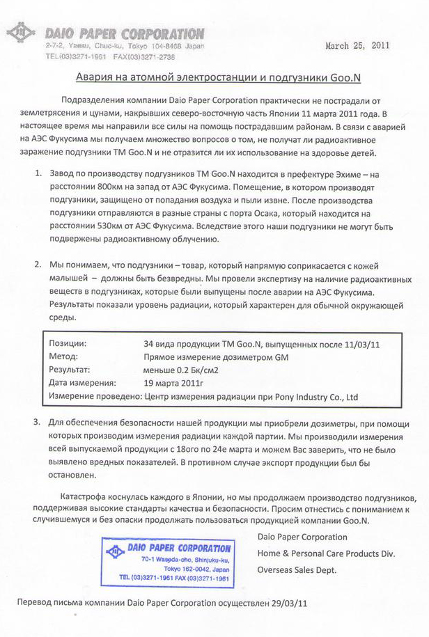 Компания Daio Paper Corporation (производитель подгузников Goo.N) через своего официального представителя в России опубликовало письмо-обращение: