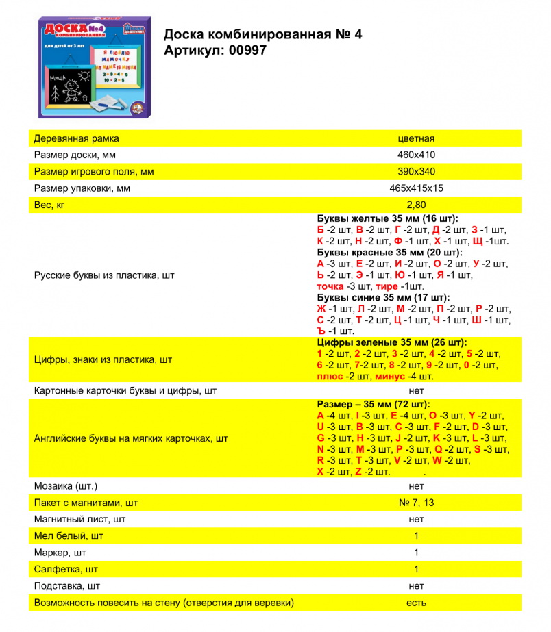 Эта незаменимая помощница взрослых при обучении ребенка грамоте и счету. Комплектуется карточками из мягкого полимерного материала с буквами английского алфавита. Одна из сторон комбинированной доски выполнена из жести окрашенной в белый цвет. На этой стороне также можно рисовать маркерами на водной основе. Вторая сторона предназначена для рисования мелками, окрашена в зеленый цвет. Рамка доски изготовлена из дерева и окрашена красками на водной основе.
