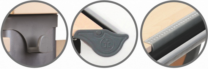 Специальные скругленные накладки - надежная защита от травм. Парта также вмещает множество приятных мелочей: желоб для ручек и карандашей, крючки для портфеля, линейка, быстро превращаются в подставку для книг, - все это необходимо для учебного процесса и всегда находится под рукой.