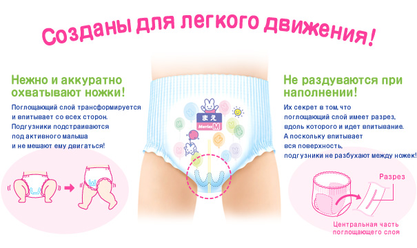 Подгузники-трусики Merries предназначены для малышей, которые начали ползать, а тем более ходить. Подгузники-трусики удобны в период обучения малыша к горшку, они надеваются и снимаются, как настоящие трусики, поэтому ребенок очень скоро научится пользоваться ими самостоятельно.